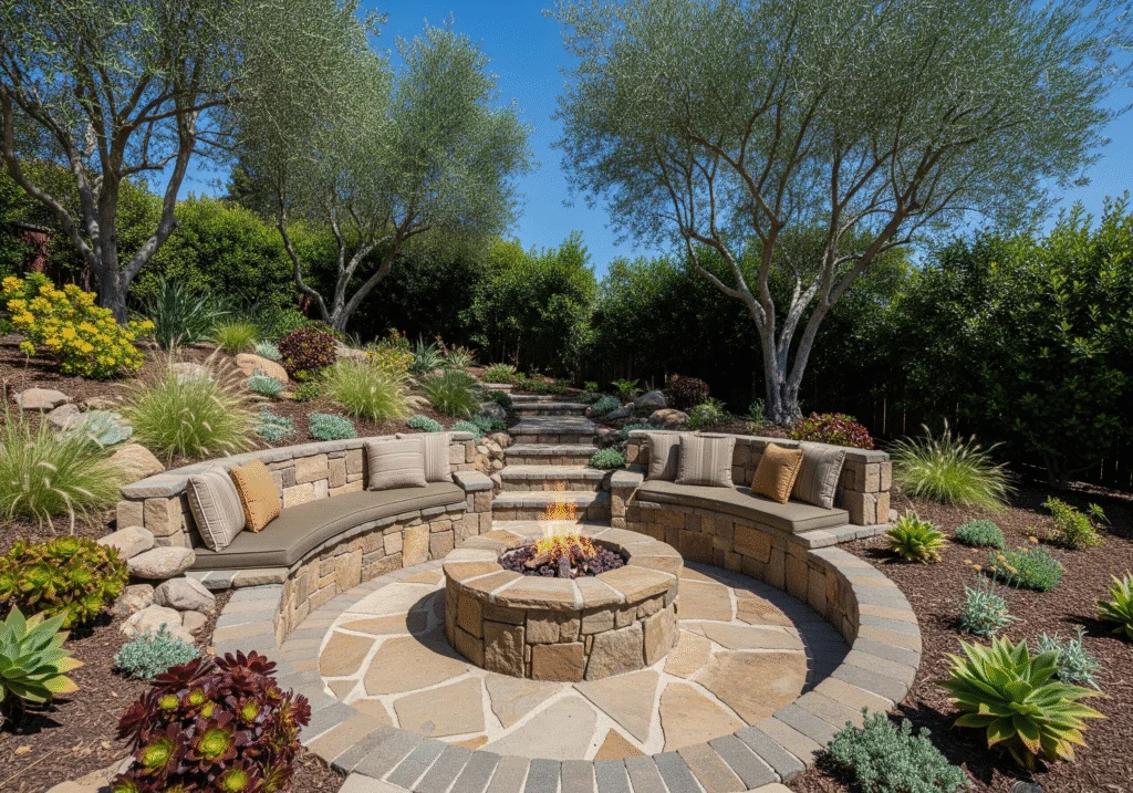 Hillside fire pit Bay Area projects require sophisticated drainage solutions preventing water accumulation and erosion. Professional installations include French drains, surface drainage channels, and proper grading ensuring water management throughout multi-level designs.