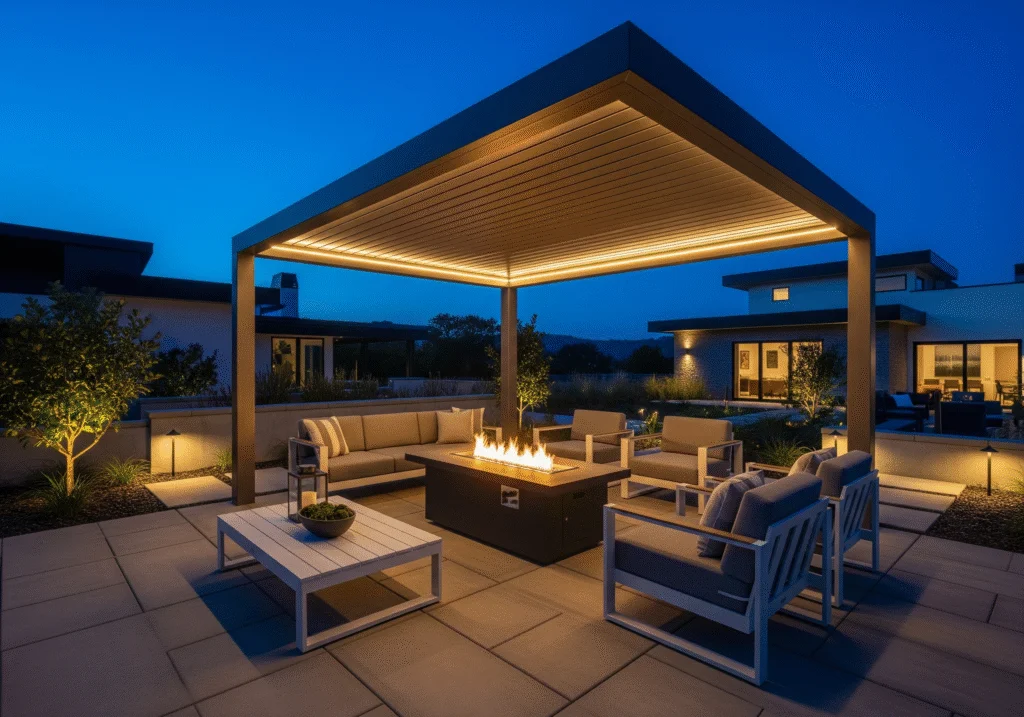 Overhead structures provide ideal mounting locations for ambient lighting enhancing fire pit Bay Area evening experiences. String lights, pendant fixtures, and integrated LED systems create layered lighting designs that transform outdoor spaces into magical evening destinations.