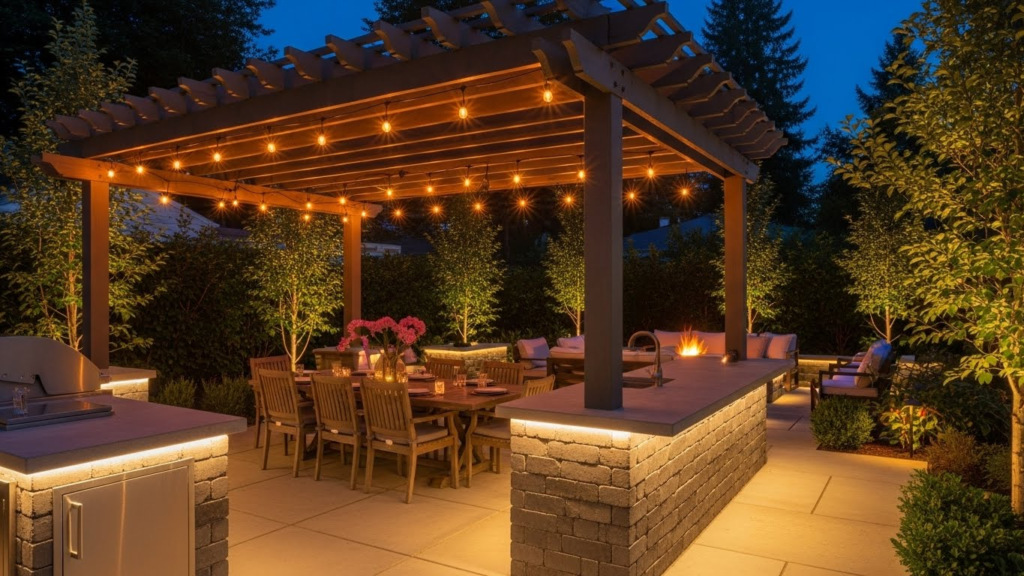 Outdoor dining and entertainment areas require layered lighting solutions. Combine overhead string lights or pendant fixtures with task lighting for cooking areas and ambient lighting for seating zones.