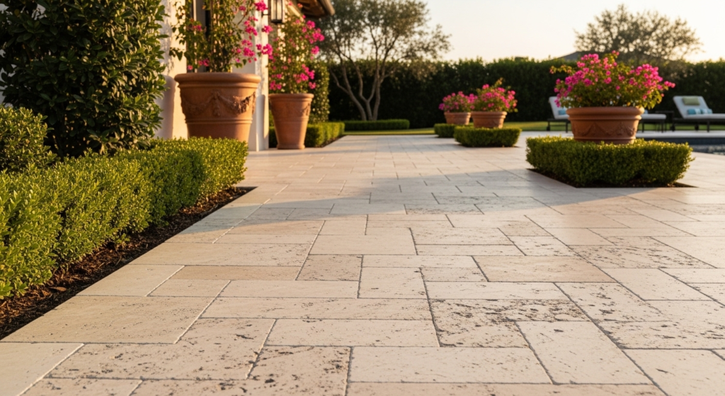 Travertine is a natural limestone that has been used in architecture for thousands of years. Its warm, creamy tones and subtle veining make it one of the most elegant paver walkway ideas for upscale residential properties.