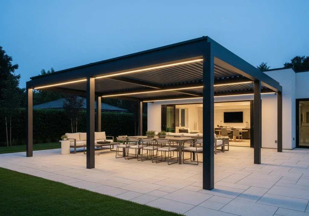 - Innovative Adjustable Louvers: Consider pergolas equipped with adjustable louvered roofs (often referred to as “bioclimatic pergolas”). These advanced systems allow you to precisely control the amount of sunlight and ventilation with a simple remote control or even a smartphone app, offering full sun, partial shade, or even complete rain protection.