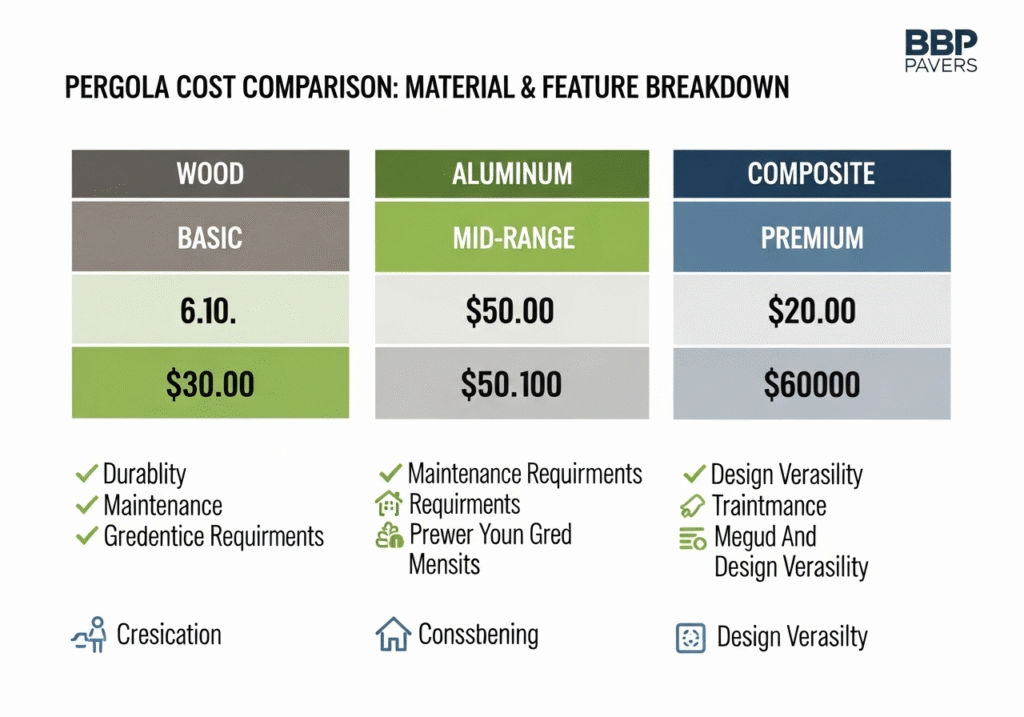 Pergola installation Walnut Creek costs range from $3,500-20,000+ depending on size, materials, and features. Basic wood pergolas start around $3,500-8,000 while premium aluminum or composite installations with integrated features cost $8,000-20,000+. BBP Pavers provides detailed estimates including all materials, labor, permits, and services ensuring transparent pricing with no hidden costs.