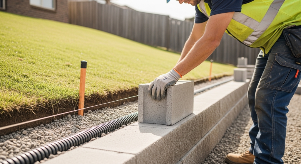 Before the wall goes up, drainage infrastructure is installed. This typically includes a perforated drain pipe at the base of the wall, surrounded by crushed gravel. Weep holes are incorporated into the wall face to allow water to escape. Skipping drainage is the number one cause of retaining wall failure.