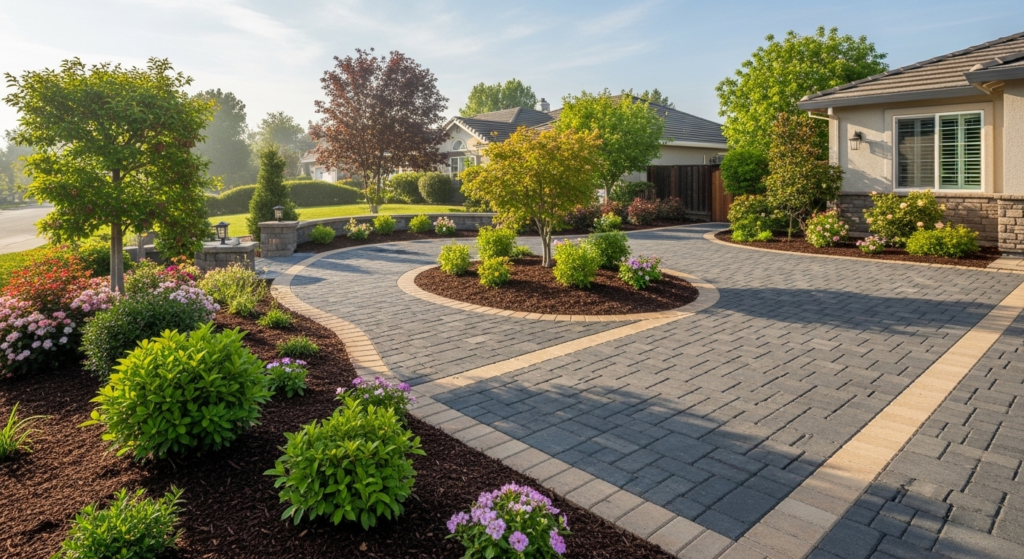 Project Overview: A Dana Estates homeowner replaced their cracked asphalt driveway with premium pavers as part of spring landscaping pavers Concord California renovation.