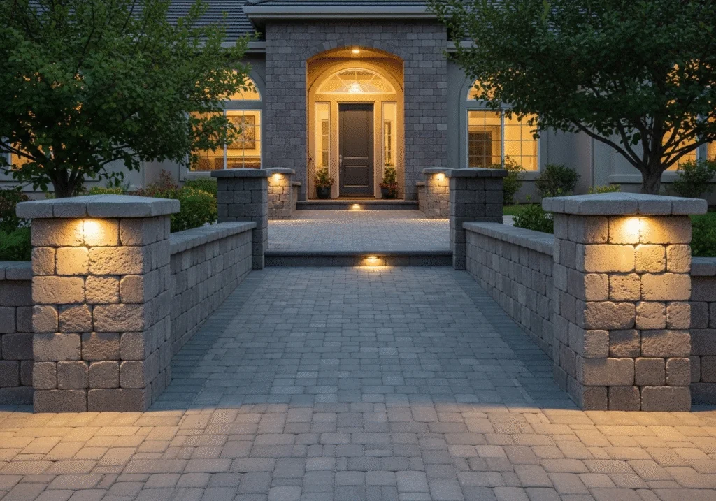 - Paver and Pillar Integration: Flank the entrance with matching paver walls and pillars for a stately and cohesive look.